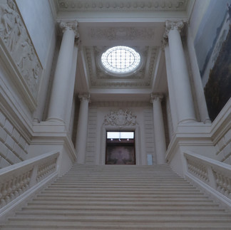 A series of combat boots line the steps of the Hermitage building in a ghostly procession with a pair of clown shoes at the top. The artwork is a social commentary, with the phrase 'the sound of boots' referencing the rise of authoritarianism and extremism. According to the artist statement, it speaks to "the escalation of violence, the path to war. The group is led by a clown, a madman who uses his position to discipline a group toward a seemingly unclear goal" It's a really excellent piece of public art.